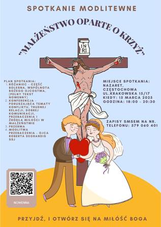 Z radością zapraszamy Was na wyjątkowe spotkanie modlitewne „MAŁŻEŃSTWO OPARTE O KRZYŻ”, które odbędzie się 15.03.2025r. w Archidiecezjalnym Ośrodku Duszpasterstwa Rodzin NAZARET